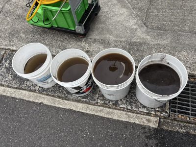右から少しづつ色が薄くなっていますが、4杯分洗浄してまだ濁った汚水が出てきました。1杯15リットルなので1台60リットル以上の水で洗浄しています。オフィスのエアコンだと2~3杯でキレイになるので、倍以上洗浄したことになります。